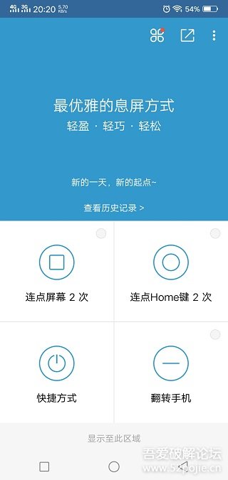 软件简介:轻息屏,优雅的息屏方式,解放你的电源键,小而美,简单而实用,主要功能: